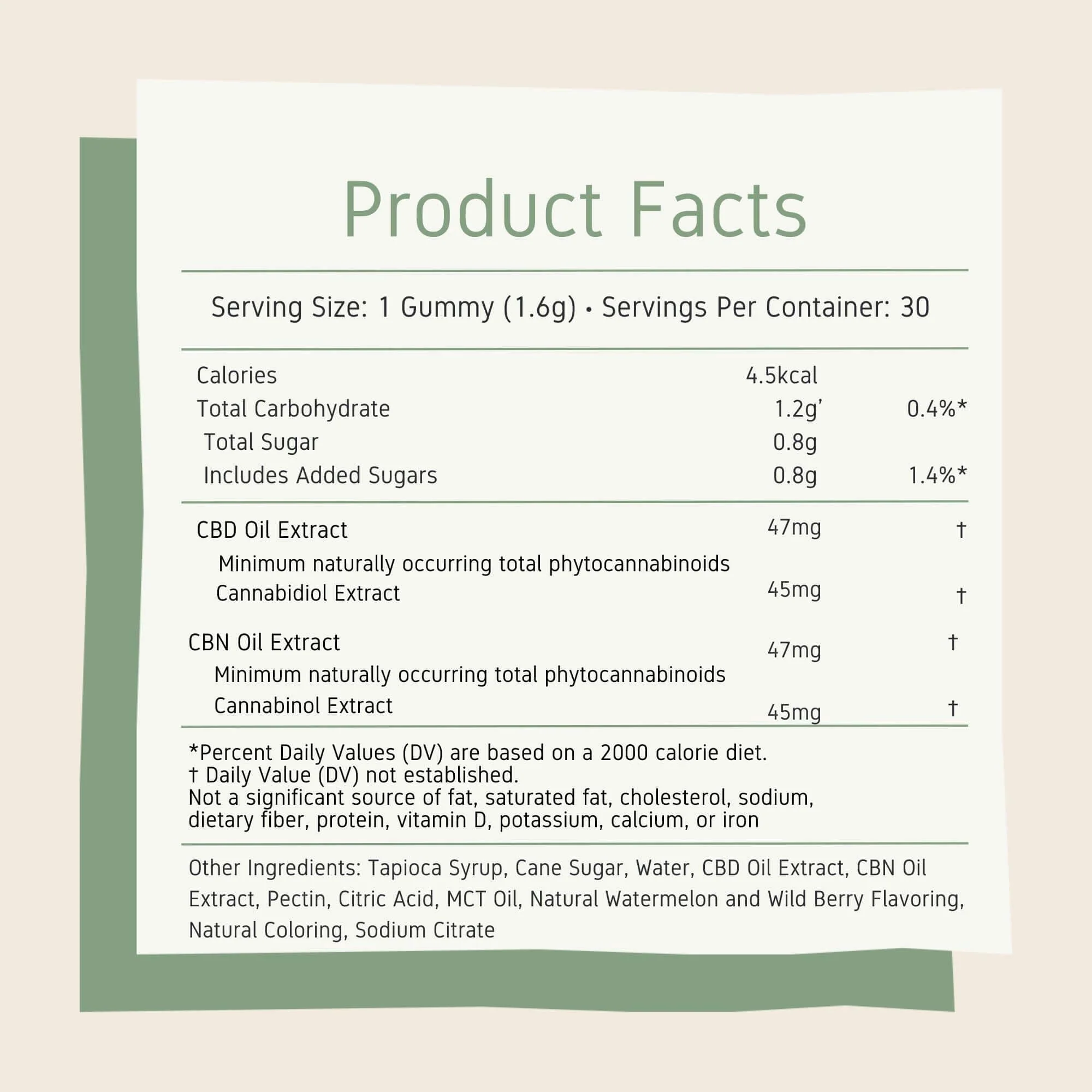 CBD:CBN gummies contain 45mg of CBD & CBN per gummy. Full spectrum hemp-extracted cannabinol with sedative effects for a nights sleep.